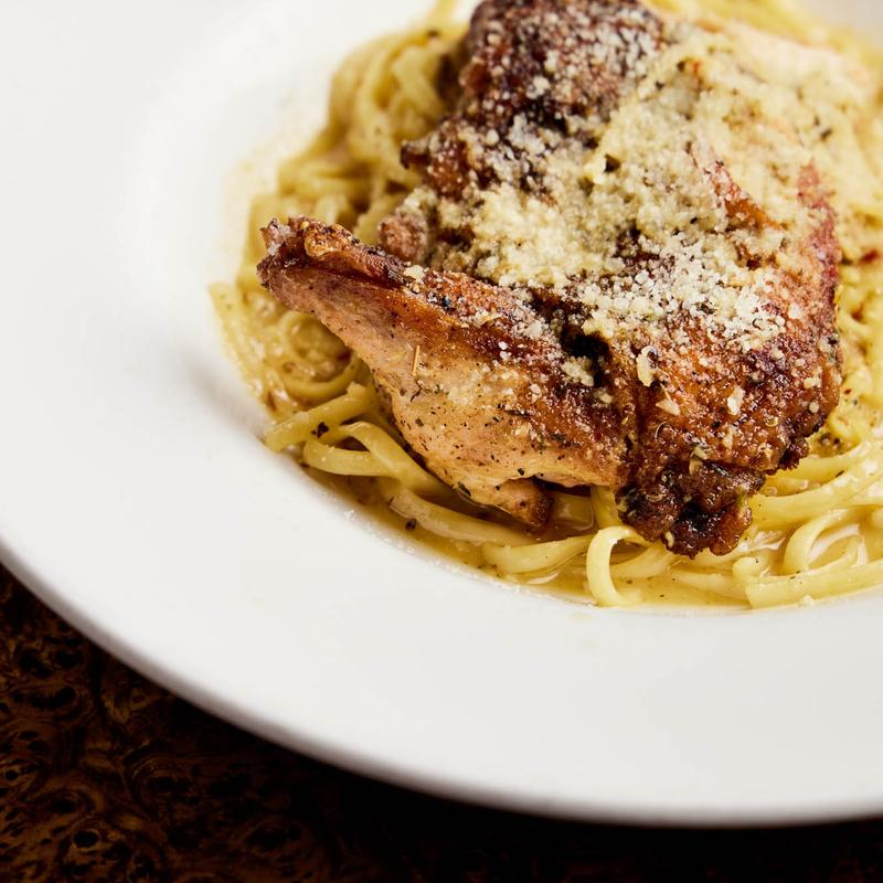 Pan roasted with oregano & lemon over linguini with olive oil, garlic, grana padano & red pepper flakes